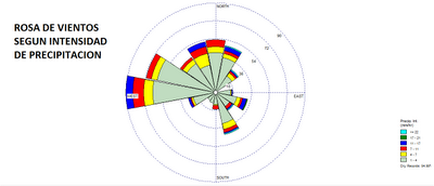 Finalmente, si nos fijamos en la rosa de vientos según la intensidad de precipitación, podemos observar la influencia de la orientación favorable de la sierra, para una mayor incidencia de los temporales de lluvia con vientos de dirección de Noreste a Oeste, responsable en parte de la gran diferencia de nº de días de precipitación y cantidad de precipitación total recogida con respecto a los observatorios situados en el valle.